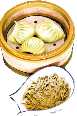 橙紅間白的蝦仁餡料,在綠油油、均勻透亮的餃子皮呵護下,像龍井茶一樣顯得更加嬌嫩,而且口感爽滑、鮮甜,淡淡的龍井清香纏繞在口腔中。