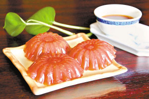 精致的紅茶盞是在原來傳統(tǒng)的馬蹄糕制作的基礎上,添加上玫瑰紅茶湯水制作而成的。玫瑰紅茶盞顏色如琥珀,入口爽滑不粘牙,濃郁的茶香給人一種飄飄然的感覺,舒心自在。