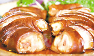 這道菜顏色誘人,做法也不會特別復雜。只要以豬手為原料,在傳統(tǒng)的鹵水上加入普洱茶葉,浸鹵2個小時而成。據何劍峰說,茶葉含有茶堿,茶堿能去肥膩,也增加了肉質的爽滑度。
