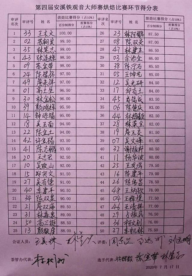 據(jù)主辦方介紹,今年舉辦的第四屆安溪鐵觀音大師賽延續(xù)了前三屆大師賽的賽制規(guī)則。根據(jù)規(guī)則,烘焙比賽要求選手必須在規(guī)定的8個(gè)小時(shí)內(nèi)用烘焙組委會(huì)統(tǒng)一提供的毛凈茶和烘焙機(jī)械,獨(dú)立完成烘焙。7月17日下午,本次烘焙比賽茶葉評(píng)審組四位評(píng)委對(duì)50位選手的烘焙茶樣進(jìn)行質(zhì)量審評(píng),按質(zhì)量高低排定名次。經(jīng)過四小時(shí)的認(rèn)真審評(píng),第四屆安溪鐵觀音大師賽烘焙比賽環(huán)節(jié)得分表出爐。